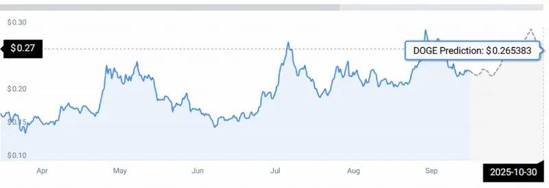 “According to our current Dogecoin price prediction, the price of Dogecoin is predicted to rise by 13.18% and reach $0.265383 by October 30, 2025. Per our technical indicators, the current sentiment is neutral, while the Fear & Greed Index is showing 50 (neutral). Dogecoin recorded 15/30 (50%) green days with 9.59% price volatility over the last 30 days. Based on the Dogecoin forecast, it’s now a good time to buy Dogecoin.”
