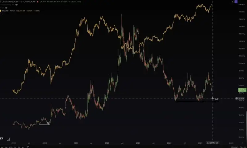He also looks at the combined dominance of the Tether-issued stablecoin USDT plus the dominance of USDC, issued by Circle, and says the chart needs to dip below 5% to trigger explosive rallies for BTC, Ethereum (ETH) and other digital assets.
